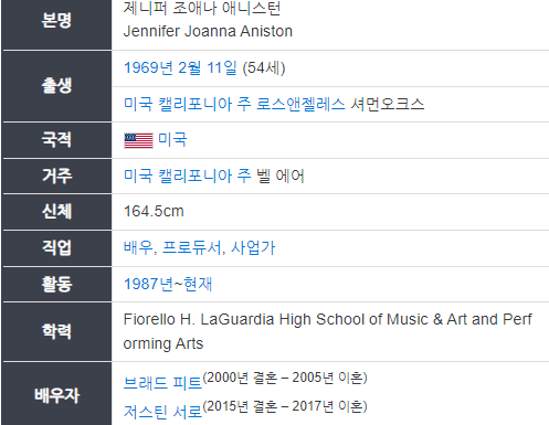제니퍼 조애나 애니스턴(Jennifer Joanna Aniston)은 미국의 배우, 프로듀서, 비즈니스우먼으로 잘 알려진 인물입니다. 제니퍼 애니스턴은 1969년 2월 11일에 캘리포니아주 로스앤젤레스에서 태어났으며, 그녀는 텔레비전 시리즈 "Friends"의 레이첼 그린 역으로 세계적인 인기를 얻었습니다.(Jennifer Joanna Aniston tunnetaan parhaiten yhdysvaltalaisena näyttelijänä, tuottajana ja liikenaisena. Jennifer Aniston syntyi 11. helmikuuta 1969 Los Angelesissa, Kaliforniassa, ja hän saavutti kansainvälisen suosion roolistaan Rachel Greenina televisiosarjassa "Friends".)