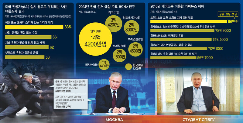 영국 주간지 이코노미스트는 지난달 “내년 선거를 치르는 국가 가운데 인구 1위인 인도(14억4200만명)를 비롯해 미국(3억4200만명), 브라질(2억1800만명), 인도네시아(2억8천만명), 파키스탄(2억4500만명), 러시아(1억4400만명) 등 전세계 인구 절반 이상이 첫 ‘인공지능 선거’를 경험하게 된다”고 전했다.이미 인공지능을 활용한 선거는 현실이 됐다.