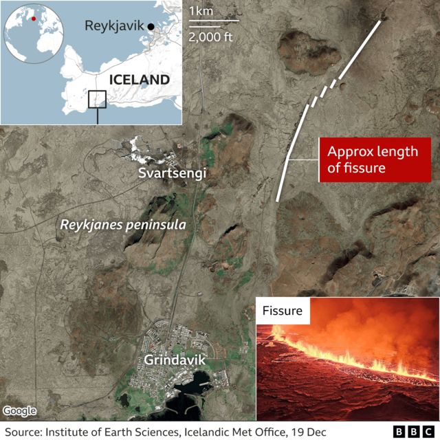 현지 기상청에 따르면 폭발로 인해 생긴 지면 균열은 약 3.5㎞로 측정되며 용암이 초속 약 100~200㎥ 정도의 속도로 흐르고 있다면서, 이는 최근 레이캬네스 반도 화산 폭발 당시보다 몇 배나 더 많다고 설명했다.