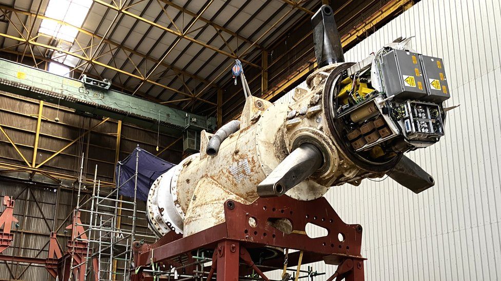 정비를 위해 가져온 150톤의 벌크는 거대한 금속 크래들에 지탱되어 있으며 복잡한 배선이 노출되어 있습니다. 풍력 터빈의 날개와 유사한 8m 길이의 날개가 바닥에 조심스럽게 배치되어 있습니다.