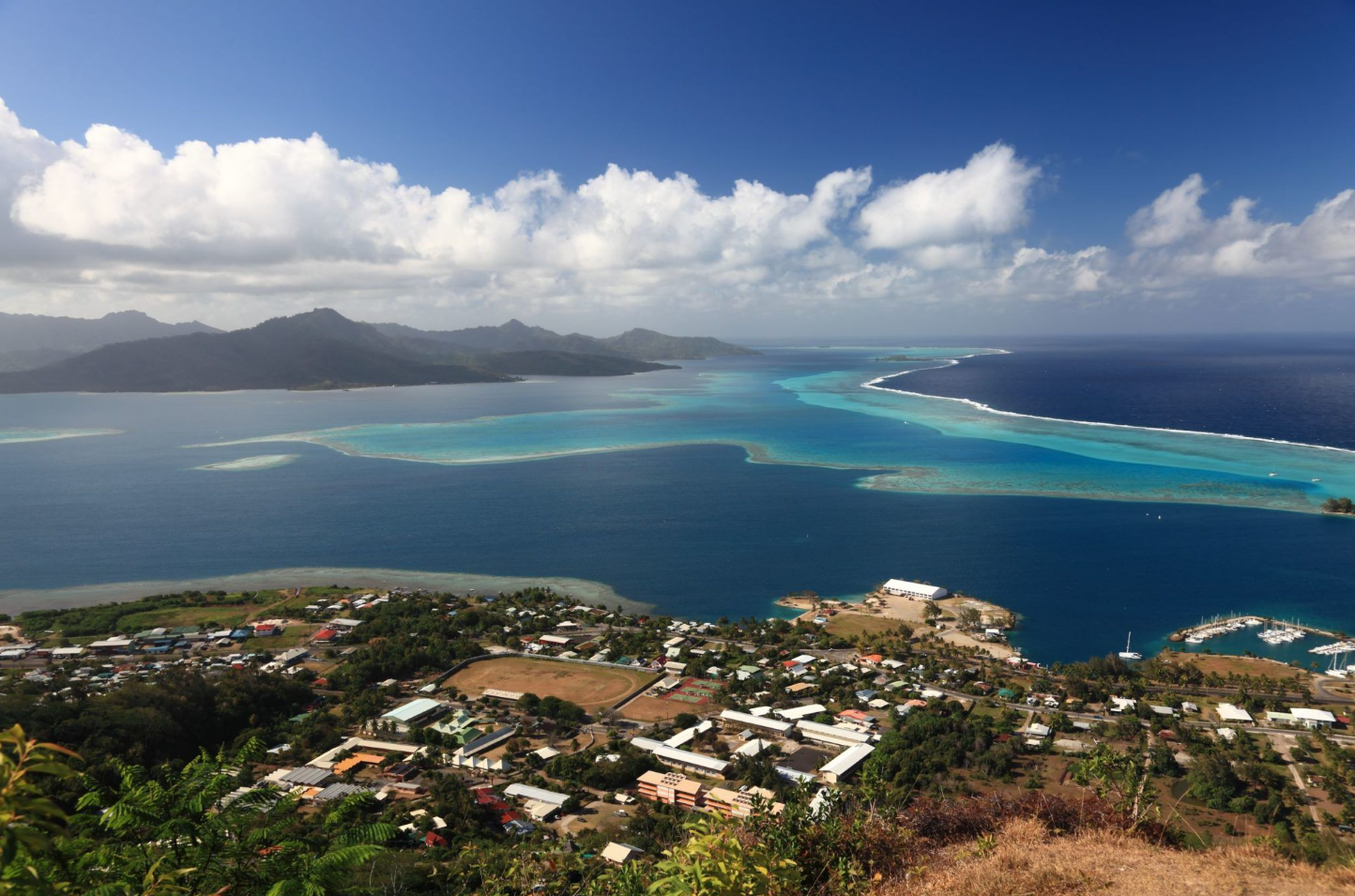 섬과 산호섬(모투) 사이에는 스펙트럼처럼 펼쳐진 환상적인 색깔을 자랑하는 거대한 라군이 형성되어 있으며, 그 라군의 경계선에는 산호섬(모투)들이 있고 그 산호섬들에 세계적인 리조트 체인들이 들어서 있다. 그리고 그 바깥으로 다시 산호초 지대(보초, barrier reef)가 형성되어 있으며 그 바깥으로 다시 대형 환초지대가 만들어져 있어서 남태평양의 거친 파도들을 모두 막아준다.