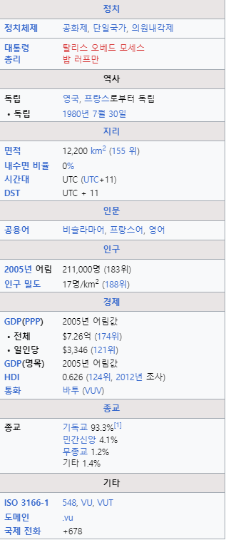 또한 열대 해양성 기후로 바누아투는 통가, 피지 같은 다른 남반구 국가들과 기후 특성도 반대이다.바누아투는 지리적 조건과, 환경적 문제로 아직까지 경제적으로 독립하지 못하였으며 현재 호주를 비롯하여 최근에는 중국으로부터 막대한 투자를 받고 있다.