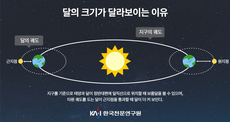 통상 정월 대보름이나 한가위 보름달이 가장 크다고 생각하지만, 실제론 그렇지 않다. 지구를 중심으로 도는 달의 궤도가 타원이라, 가장 먼 지점의 보름달이 가장 작고 가장 가까운 지점의 달이 가장 커 보인다. 24일 보름달은 올해 가장 작게 보이는 보름달로, 가장 큰 보름달은 10월17일 보름달일 것이라고 천문연은 밝혔다. 이때 달 크기는 약 14% 차이가 난다.