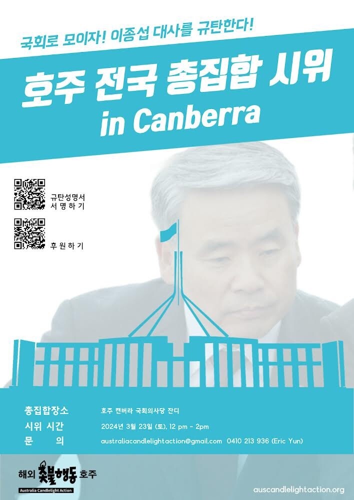이날 행사에서 호주 교포들은 “이종섭 대사가 사퇴하는 그날까지 집회를 이어갈 예정”이라며 “호주 교민 사회는 이종섭 전 국방부 장관의 주호주 대사 임명에 대해 심각한 모욕을 느끼며, 이는 윤석열 정부의 해외동포에 대한 무시와 국제적 망신이라고 간주한다”고 밝혔다.