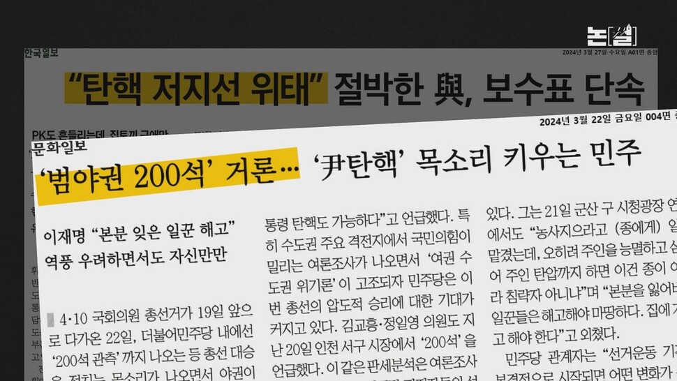 조선일보 등 보수 매체도 범야권 200석 가능성을 발빠르게 기사화했고, 일부 칼럼은 정권 존망의 위기 상황이라는 주장까지 편 바 있습니다. 위기감을 불러일으켜 보수를 결집하려는 의도로 읽힙니다.