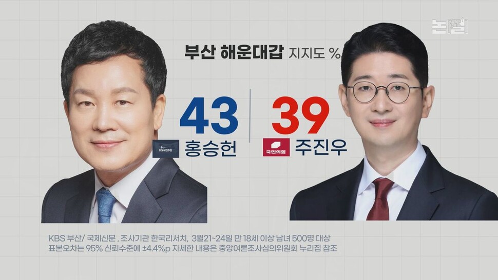 ‘낙동강 벨트’가 포함된 부산·경남에선 최근 민주당 선전 기류가 완연한 여론조사 결과가 잇따라 나오고 있습니다. 한국리서치(KBS부산·국제신문 의뢰)가 21~24일 실시한 조사에선 민주당 현역 의원이 버틴 부산 사하갑, 북구갑, 경남 양산을에서 모두 민주당 후보가 국민의힘 후보를 오차범위 바깥에서 앞서는 것으로 나타났습니다. 반대로, 4년 전 국민의힘이 차지한 부산 사상, 해운대갑에선 민주당 후보가 오차범위 안에서나마 국민의힘 후보를 앞서는 결과가 나왔습니다. 역시 국민의힘이 승리했던 부산 연제구에선 민주당과 야권 단일화에 성공한 노정현 진보당 후보(47.6%)가 김희정 국민의힘 후보(38.3%)를 오차범위 밖으로 따돌리는 결과가 나오기도 했습니다.(부산일보·부산MBC-한국사회여론연구소 18~19일 조사)