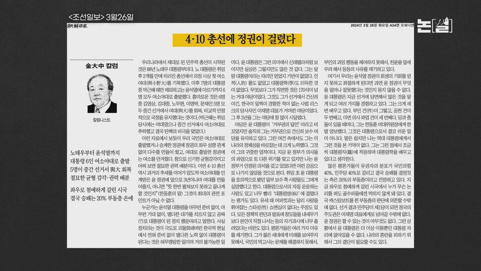“어제 오늘 계속 나왔던 조선일보의 모습을 보면 일단 지지층 결집의 효과를 노리는 거죠. 이러다가는 개헌 저지선까지 넘어갈 수 있다, 투표해 달라 이런 겁니다. (…) 또 하나는 저는 더 크게 보는 것은 대통령실에 얘기하는 것 같아요. (…) 고집을 부리지 말고 민심을 좀 받아들이세요라는 말을 조선일보 또 여당 내에서 하는 거라고 봐요.”