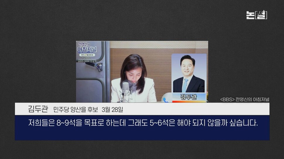 “당 지지율은 지금 국민의힘이 그래도 높거든요. 최근에 우리가 약간 추월한 게 하나 정도 여론조사에 잡혔는데 당 지지율은 여전히 국민의힘이 높지만 우리 정권심판론이 작동하고 있는 것 같고, 바닥에.”(김두관 민주당 의원·경남 양산을 후보, 28일 BBS ‘전영신의 아침저널’)
