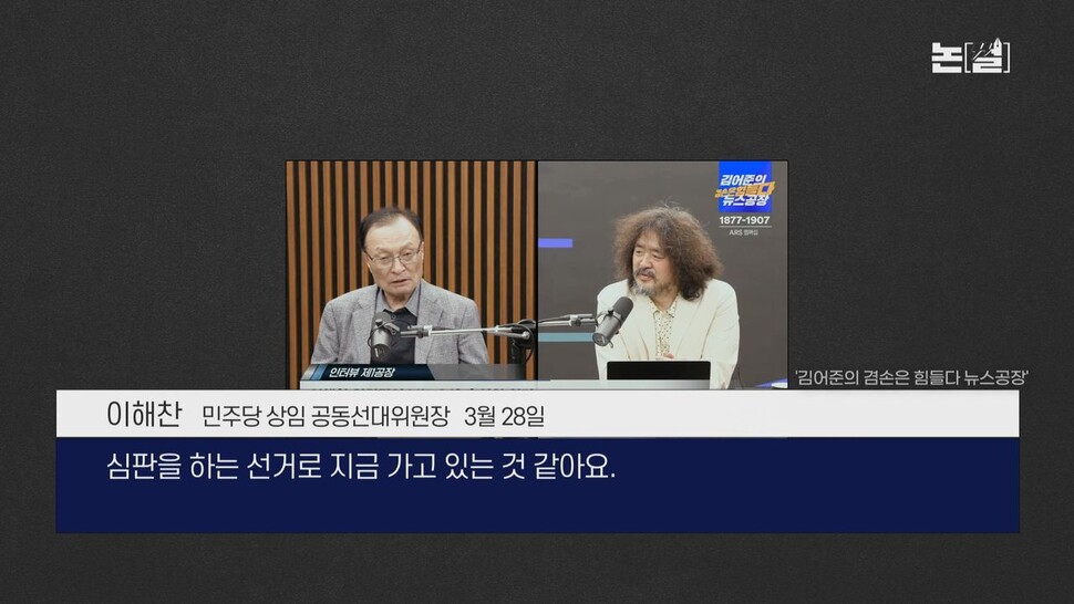 “다만 이 정권의 실정을 막고 또 이걸 국회에서 입법한 여러가지 민생개혁 입법들이 대통령에 의해서 거부권이 행사되고 국회로 다시 넘어와서 재의결되지 못하고 부결되는 상황을 보면서 (…) 야권의 입장에서는 그런 의석수도 달라고 호소하는 것이 당연하지 않느냐.”(진성준 민주당 의원·서울 강서을 후보, 27일 MBC ‘김종배의 시선집중’)