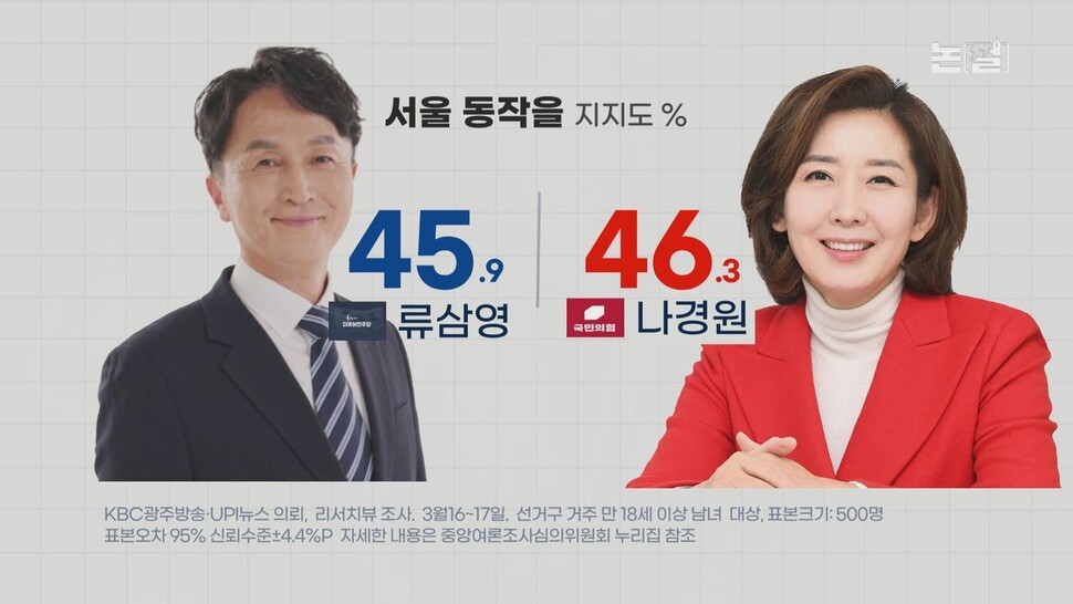 물론 당시 민주당이 이긴 지역구에서 지금 국민의힘이 우세나 경합 양상을 보이는 곳도 동작갑·을, 분당을 등이 있습니다. 그러나 그 격차는 갈수록 줄어드는 흐름입니다. 동작을의 경우 3월4~5일 조사(여론조사꽃)에선 나경원 국민의힘 후보(44.2%)가 류삼영 민주당 후보(34.7%)를 오차범위 밖에서 앞섰지만, 3월16~17일 조사(리서치뷰)에선 나 후보(46.3%)와 류 후보(45.9%) 격차가 소수점 아래로 바짝 붙는 결과가 나왔습니다.(자세한 내용 중앙여론조사심의위 홈페이지 참조. 이하 동일) 정권심판론의 직격탄을 맞은 결과라는 풀이가 나왔습니다.