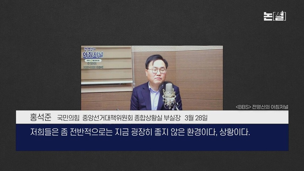 “저희들은 전반적으로는 지금 굉장히 좋지 않은 환경이다, (…) 단지 그런 안 좋은 것이 지난주에 바닥을 찍었다. 이렇게 지금 판단을 하고 있습니다.”(홍석준 국민의힘 중앙선대위 종합상황실 부실장, 28일 BBS ‘전영신의 아침저널’)