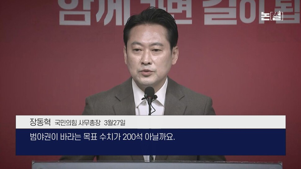 “범야권의 목표 수치가 200석 아니겠나. 의회 독재, 범죄자 독재가 되는 것을 막기 위해서는 (여당이) 최선을 다해 많은 의석을 차지해야 한다.”(장동혁 국민의힘 사무총장, 27일 기자들과 만나)