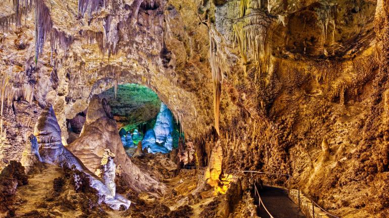 바위투성이 비탈과 협곡, 선인장, 풀, 가시나무, 그리고 뜨문뜨문 나무가 서 있는 칼즈배드 동굴 국립공원(Carlsbad Caverns National Park)의 이 험준한 땅 아래에는 알려진 동굴만 118개가 넘으며, 이 모든 동굴은 황산이 주변 석회암을 녹이면서 형성된 것입니다. 칼즈배드 동굴(Carlsbad Cavern)은 2억 5천만 년에서 2억 8천만 년 전 내해에 의해 만들어진 화석 암초에 있는 한 동굴입니다.