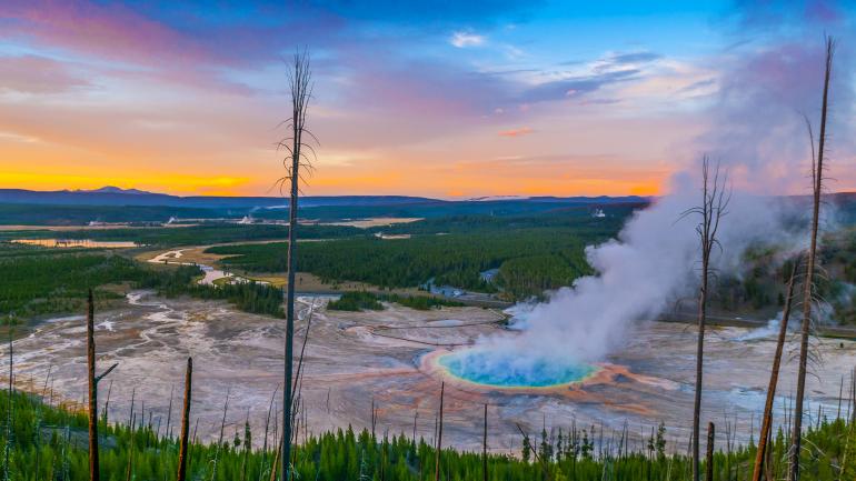 옐로스톤 국립공원(Yellowstone National Park)은 세계에 알려진 모든 지열 지형 중 절반(10,000개)이 존재하는 곳이자, 세계에서 가장 많은 간헐천(지구상에 있는 간헐천의 3분의 2에 해당하는 300개 이상)이 밀집된 곳입니다. 회색곰, 늑대, 들소, 엘크 등의 풍부하고 다양한 야생 동물이 살고 있는 곳으로도 유명합니다. 옐로스톤은 미국 최초의 국립공원으로 세계 각지의 방문객을 끌어모읍니다.