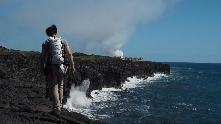 하와이 화산 국립공원 해안의 화산암 지대를 가로질러 하이킹하기
