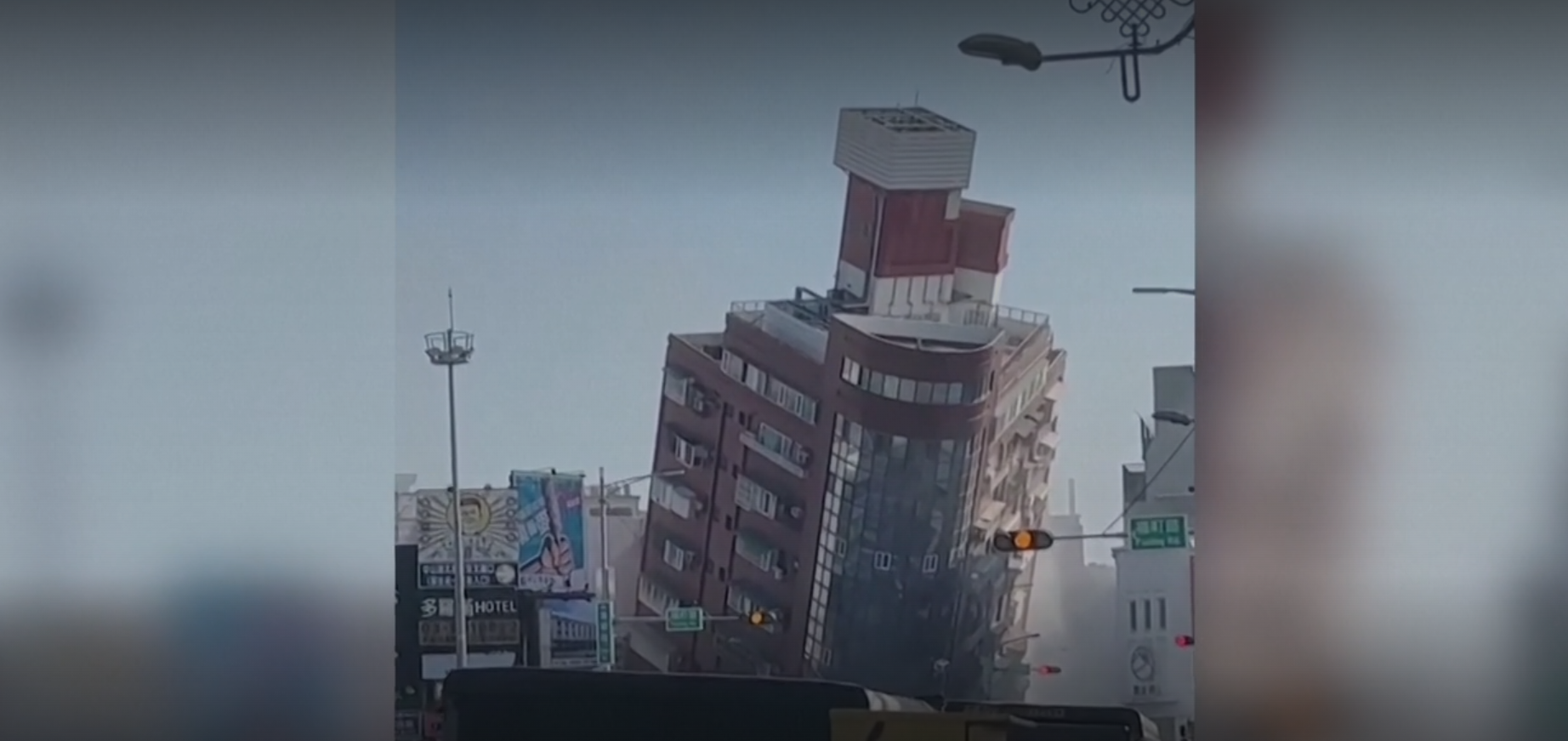 여기 화롄시에서 그 모습을 확인할 수 있다. 많은 카메라 팀이 보기에도 무서운 각도로 기울어진 10층짜리 건물 주변에 몰려 있다. 기괴하고 무서운 광경이다. 하지만 이 건물은 빌딩 수만 채가 있는 이 도시에서 구조적 피해를 겪은 극히 일부에 불과했다.