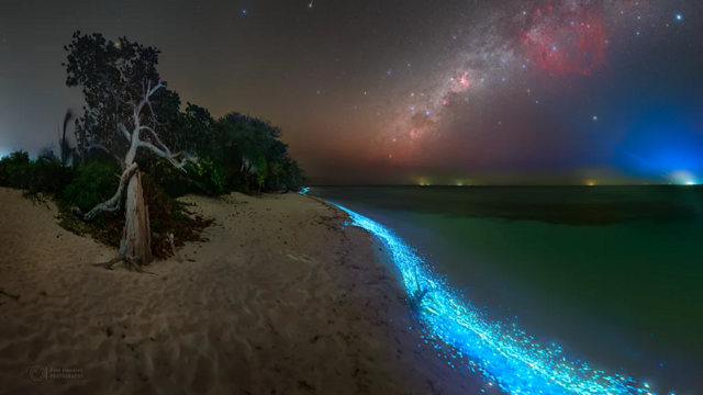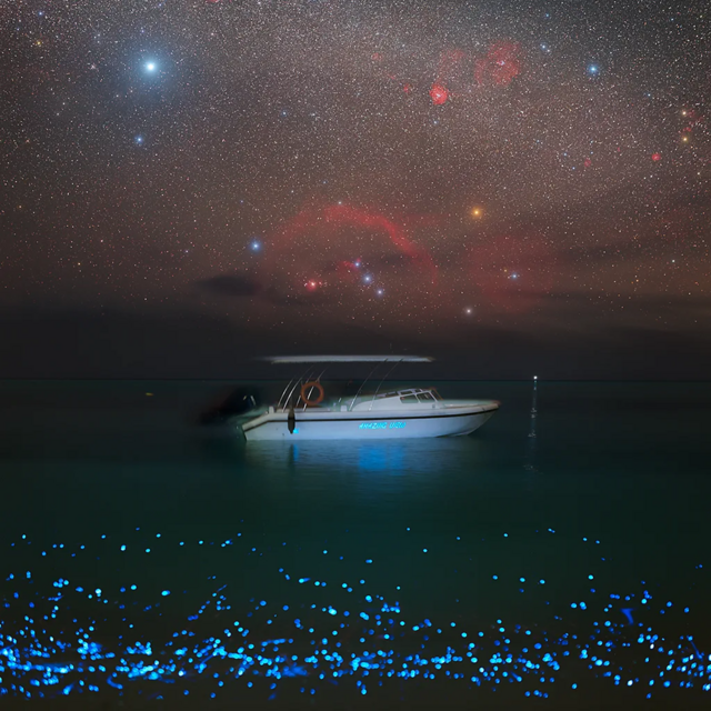 당시 우리가 탄 보트는 해질 무렵 섬으로 다가가고 있었다. 보트가 내뿜는 물보라 속에서 파란색으로 빛나는 물방울들이 흩어졌다. 일렁이는 파도 아래엔 포식성 물고기들이 사냥중인 유리빛 라군이 있었고, 그 안에 작고 푸른 빛의 웅덩이가 있었다. 친구들과 나는 해안가에 배를 대고, 해변을 따라 달렸다. 파랗게 빛을 내는 파도가 우리를 향해 밀려왔다. 뉘엿뉘엿 저물던 해가 완전히 모습을 감추자, 플랑크톤은 더할 나위 없이 밝게 빛났다. 우리는 물속으로 머리를 들이밀었다. 입이 떡 벌어질 만한 황홀한 광경에 우리는 바닷물을 잔뜩 들이마실 뻔했다.