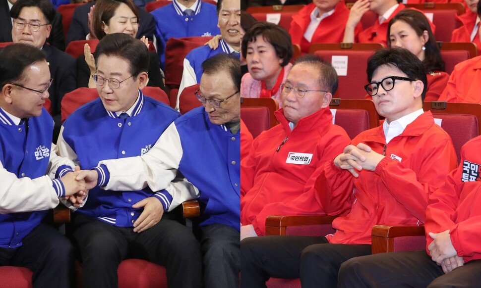 22대 총선 방송 3사 출구조사 결과가 발표된 10일 이재명 대표를 비롯한 더불어민주당 지도부가 서로 격려하고 있다. 같은 시각 한동훈 비상대책위원장 등 국민의힘 지도부가 굳은 표정으로 출구조사 결과를 지켜보고 있다. 연합뉴스