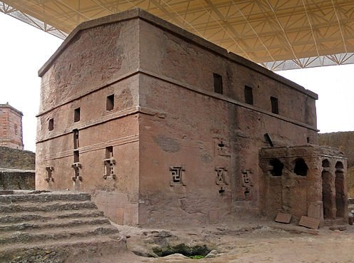Biete Medhane Alem(세계 구세주의 집), Lalibela 십자가 자리, 세계에서 가장 큰 단일체 교회로 여겨지며 아마도 Axum에 있는 시온의 성모의 사본일 것입니다.