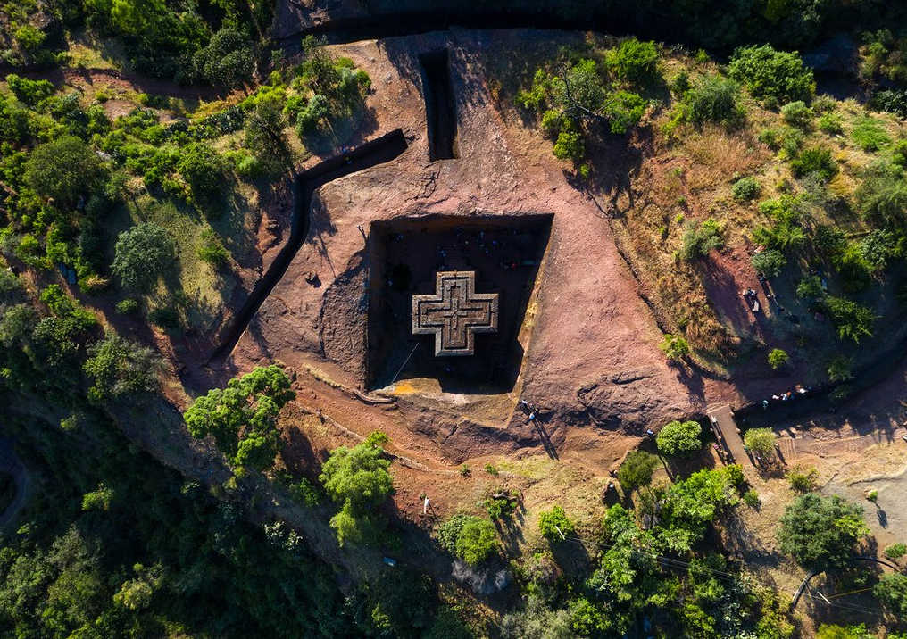 Biete Medhane Alem(세계 구세주의 집), Lalibela 십자가 자리, 세계에서 가장 큰 단일체 교회로 여겨지며 아마도 Axum에 있는 시온의 성모의 사본일 것입니다.