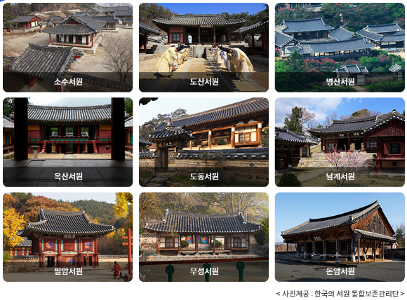 한국의 서원(16세기 중반부터 17세기 건립)은 조선시대 성리학 교육기관의 유형을 대표하는 9개 서원으로 이루어진 연속유산으로, 한국의 성리학과 연관된 문화적 전통에 대한 탁월한 증거이다.
