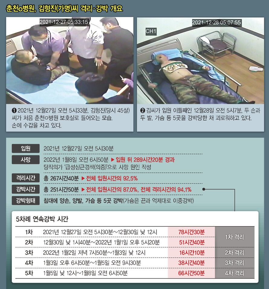 3일 한겨레는 춘천ㅇ병원에서 응급입원되자마자 251시간50분 격리·강박된 뒤 입원 289시간20분(12일1시간) 만에 숨진 김형진(가명·45)씨 사건을 계기로, 인권위에 진정이 접수된 정신병원들의 격리·강박 실태를 살펴보았다. 춘천ㅇ병원은 의사의 지시는 있었지만 환자 보호 지침이 전혀 지켜지지 않은 채 격리·강박이 시행된 경우였다면, 일부 병원은 병실이 아닌 ‘별도의 장소에서 격리·강박이 이뤄져야 한다’는 규정을 위반해 문제가 됐다.