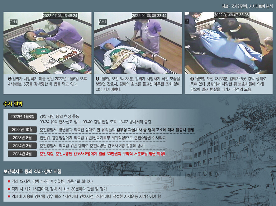 손과 발, 가슴을 단단히 묶는다. 환자는 마치 십자가에 못 박힌 것처럼 침대에 결박되어 누워 있다. 299개 병상을 갖춘 작은 정신병원인 춘천ㅇ병원에서 환자는 구원받지 못했다. 한겨레가 입수한 시시티브이 영상에서 환자는 매일 신음하고 괴로워하며 몸부림치다 서서히 죽어갔다. 의사도, 간호사도, 보호사도 적절한 구호조처를 외면했다. 영상 속에 등장하는 모든 인물들이 그 죽음의 동조자인 것처럼 보인다.
