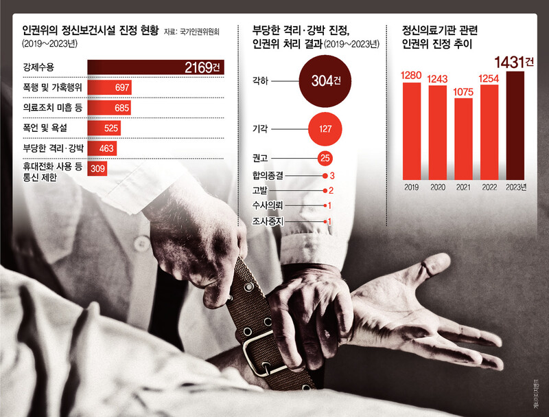 인권위의 최근 5년간(2019~2023년) 정신보건시설 진정처리 현황에 따르면 ‘부당한 격리·강박’에 대한 진정은 463건으로 강제수용(2169건), 폭행 및 가혹행위(697건), 의료조치 미흡 등(685건), 폭언 및 욕설(525건)에 이어 다섯번째로 많았다. 하지만 이는 대표 진정을 중심으로 정리한 통계로, 대부분 중복 진정이라는 점을 고려하면 부당한 격리·강박은 이보다 더 많을 것으로 보인다.