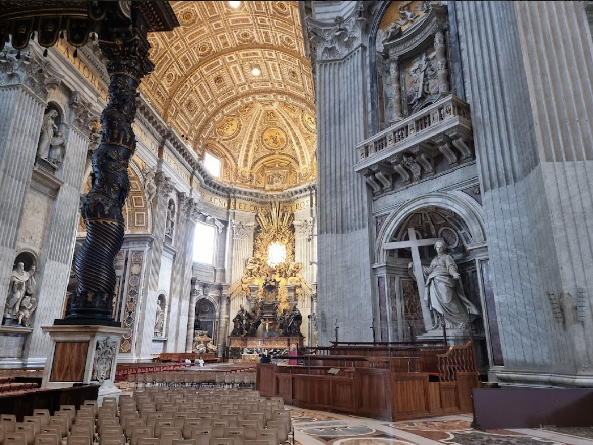 베르니니의 성 베드로 주교좌: 성당의 중앙 제단 위에는 성 베드로 주교좌가 위치하며, 이는 베르니니에 의해 제작된 화려한 금속 조각으로 장식되어 있습니다. 이 조각은 성 베드로의 권위를 상징합니다.