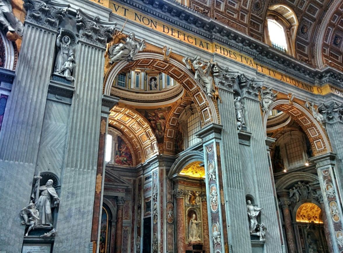 성 베드로 대성당의 내부는 화려한 장식과 예술 작품으로 가득 차 있습니다. 성당 내부의 길이는 약 186m, 너비는 120m에 달하며, 대규모의 홀은 수천 명의 신자를 수용할 수 있습니다. 내부의 가장 눈에 띄는 부분 중 하나는 '피에타(Pietà)'라는 미켈란젤로의 조각 작품입니다. 이 작품은 성모 마리아가 십자가에서 내려온 예수 그리스도를 품에 안고 있는 모습을 담고 있으며, 그의 예술적 기교와 감정을 잘 나타냅니다.