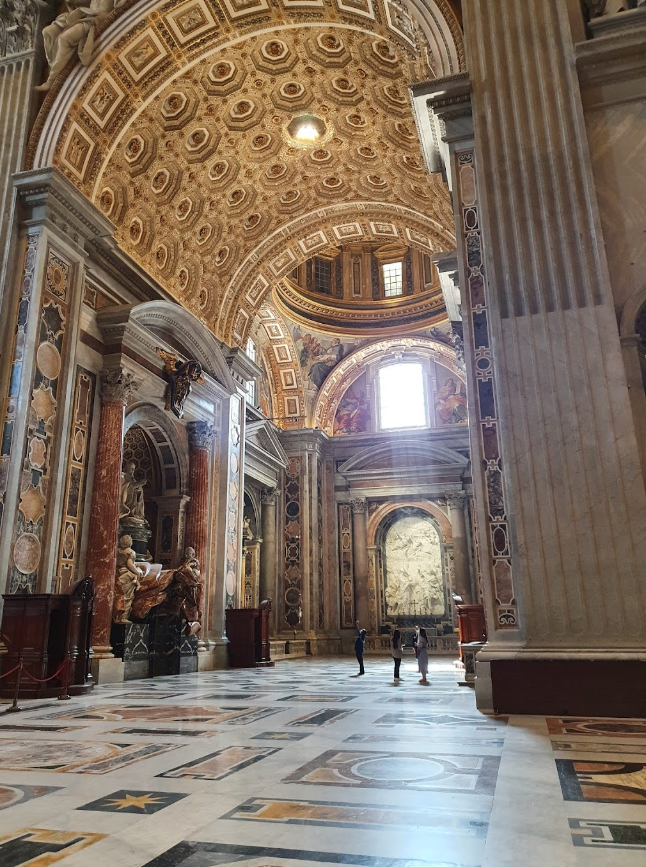 베르니니의 성 베드로 주교좌: 성당의 중앙 제단 위에는 성 베드로 주교좌가 위치하며, 이는 베르니니에 의해 제작된 화려한 금속 조각으로 장식되어 있습니다. 이 조각은 성 베드로의 권위를 상징합니다.