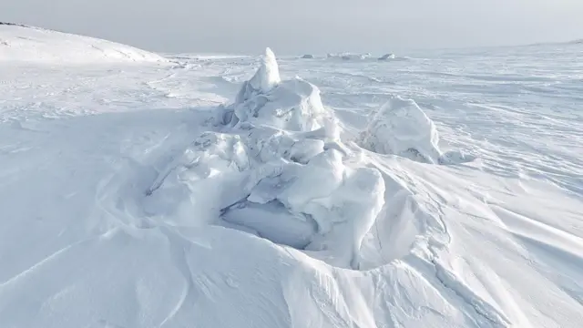 우리는 다니엘센의 산장을 더나 동쪽으로 20km쯤 나아갔다. 눈과 얼음 위를 썰매가 미끄러지는 동안 이어지는 주변 풍경과 평온함은 오로지 감탄이었다. 극지방의 부드러운 햇살은 푸른 빛깔의 얼음을 어루만지고, 다시 안개가 어우러져 환상의 세계를 만들어 냈다. 그 속에서 우리는 우뚝 솟은 빙산과 자연이 조각해낸 얼음 작품들을 지나쳐 앞을로 나아갔다. 풍경 사진가들이라면 이 곳을 천국으로 생각할 것이다.