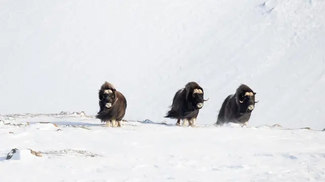 뺨 부위에서 튀어나온 짧은 뿔, 검은색과 황갈색이 섞인 긴 털을 강풍 속에서 흩날리는 사향소는 흡사 선사 시대 동물처럼 보였다. 특히 400kg에 달하는 거대한 체중에서 오는 위풍당당함은 사진으로 담기에 안성맞춤이었다.