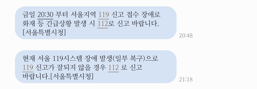 [1] 오마이뉴스 - 서울 지역 119 신고접수 45분간 장애 "원인 파악중" (https://www.ohmynews.com/NWS_Web/View/at_pg.aspx?CNTN_CD=A0003063686)
