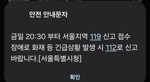 [1] 오마이뉴스 - 서울 지역 119 신고접수 45분간 장애 "원인 파악중" (https://www.ohmynews.com/NWS_Web/View/at_pg.aspx?CNTN_CD=A0003063686)