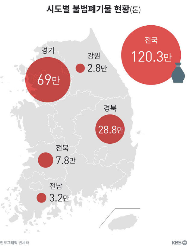 그림에서 보듯이, 경기도는 무려 690,000톤의 불법 폐기물이 쌓여 있어 가장 큰 문제를 안고 있습니다. 강원도와 경북도 각각 28,000톤과 288,000톤으로 뒤를 잇고 있으며, 전북과 전남도 각각 78,000톤과 32,000톤에 달합니다.