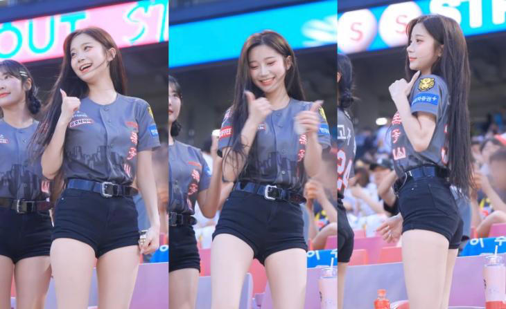 다음으로, 우리 주인공인 이주은 치어리더를 소개할게! 그녀는 정말 에너지가 넘치고 밝은 미소로 관중들을 사로잡는 매력이 있어.