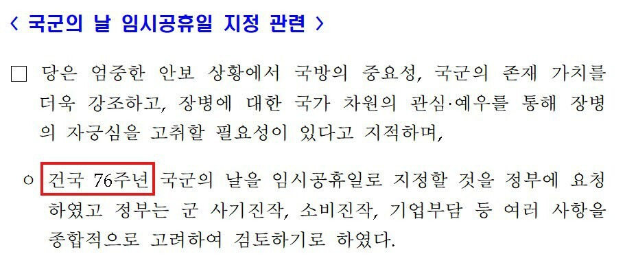 [1] 한겨레 - 올해 국군의날 임시공휴일 지정 국무회의 의결 예정 (https://www.hani.co.kr/arti/politics/politics_general/1156656.html)