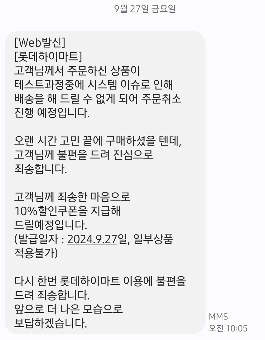 롯데하이마트는 고객들에게 문자 메시지를 통해 시스템 오류로 인해 주문이 취소된다는 사실을 알리며, 사과의 뜻을 전했습니다. 문자 내용은 다음과 같습니다.