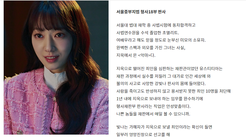 드라마 "지옥에서 온 판사"는 정말 흥미진진한 이야기로 가득 차 있어. 이 드라마는 살인 지옥의 판사이자 정의 여신 유스티티아가 지옥에서 판사로 살인자들을 엄벌을 내리다가 엉뚱한 곳에 온 강빛나의 영혼을 살인 지옥으로 보내버리는 만행을 저질러 지옥형벌을 받게 되는 에피소드의 시작부터 시작해. 이 드라마는 강빛나가 인간적인 열혈형사 한다온을 만나면서 벌어지는 사건들을 다루고 있어.