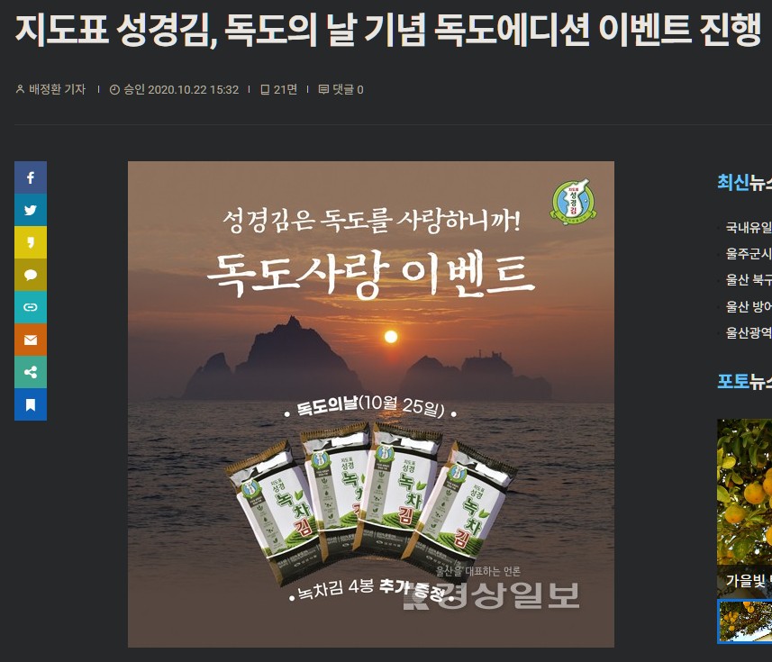[4] guring-gu.co.kr - 지도표 성경김 '독도의 날 리미티드 독도김 에디션' 출시 (https://guring-gu.co.kr/%EC%A7%80%EB%8F%84%ED%91%9C-%EC%84%B1%EA%B2%BD%EA%B9%80-%EB%8F%85%EB%8F%84%EC%9D%98-%EB%82%A0-%EB%A6%AC%EB%AF%B8%ED%8B%B0%EB%93%9C-%EB%8F%85%EB%8F%84%EA%B9%80-%EC%97%90%EB%94%94%EC%85%98/)