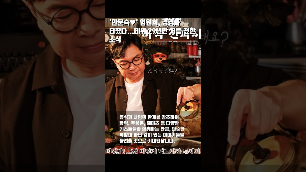 [4] Daum - '안문숙 ' 임원희, 겹경사 터졌다...데뷔 29년만 처음 전한 소식 (https://v.daum.net/v/20241023052209758)
