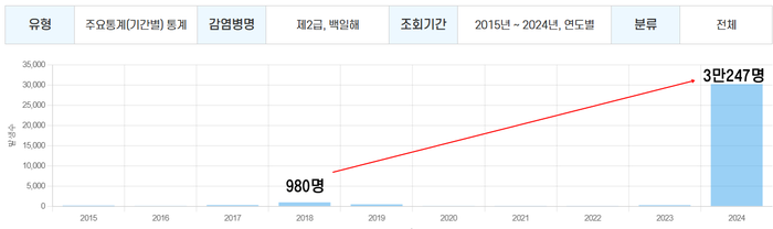[2] 조선일보 - 국내 첫 백일해 사망자 발생 올해 환자 수, 이미 전년의 104배 (https://www.chosun.com/economy/science/2024/11/12/QR6PPV4K64ORT3RLHU37IV772Q/)
