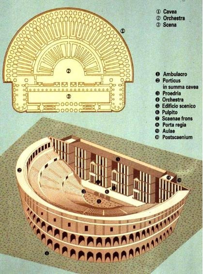 이 그림은 고대 극장의 구조를 자세히 보여주며, 관객석과 무대의 배치를 한눈에 볼 수 있습니다.