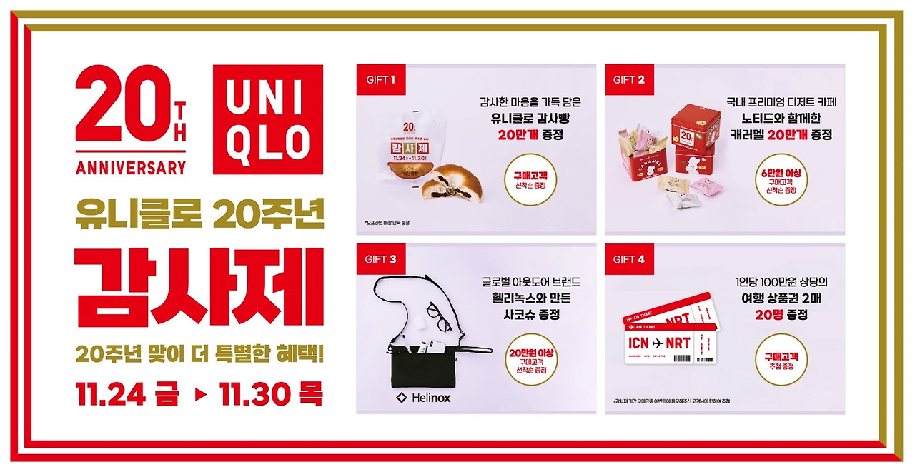 유니클로는 매년 감사제를 통해 고객들에게 감사의 마음을 전하고 있어요. 올해는 특히 20주년을 맞이하여 더욱 특별한 이벤트가 준비되었답니다. 유니클로의 다양한 제품을 저렴한 가격에 구매할 수 있는 기회이니, 놓치지 마세요!