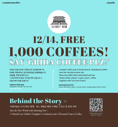 그리다씨는 최근에 서울 여의도 국회의사당 인근의 카페에서 1000잔의 커피를 선결제했어. 이 커피는 12월 14일에 있을 촛불 시위에 참석하는 시민들을 위해 준비된 거야. 그녀는 "아침이슬로 다시 만난 세계: 어느 계엄군 딸의 고백문"이라는 제목의 글을 SNS에 올리면서 자신의 마음을 전했어.