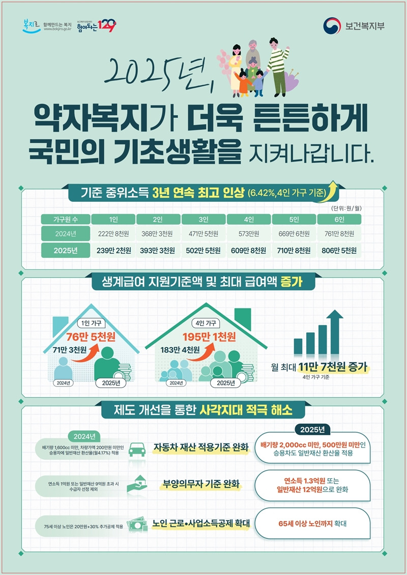 - 2025년도 기준 중위소득 6.42%로 역대 최대 인상 - 보건복지부