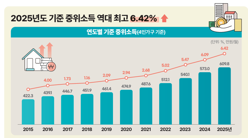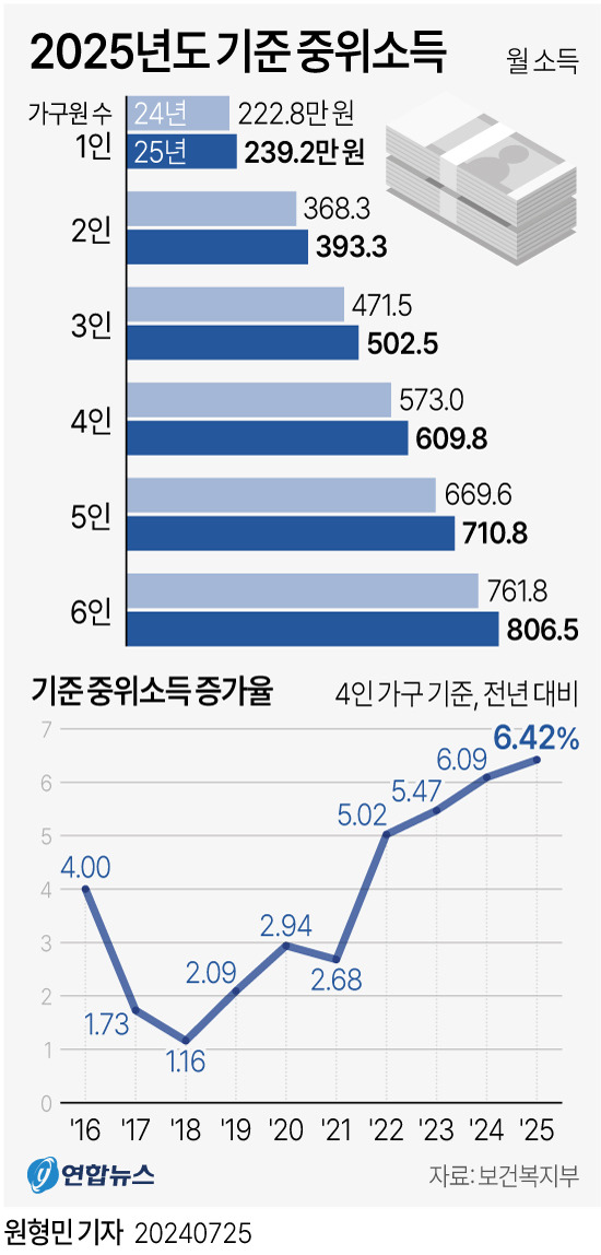[1] mohw.go.kr - 2025년도 기준 중위소득 6.42%로 역대 최대 인상 ... - 보건복지부 (https://www.mohw.go.kr/board.es?mid=a10503000000 list_no=1482430