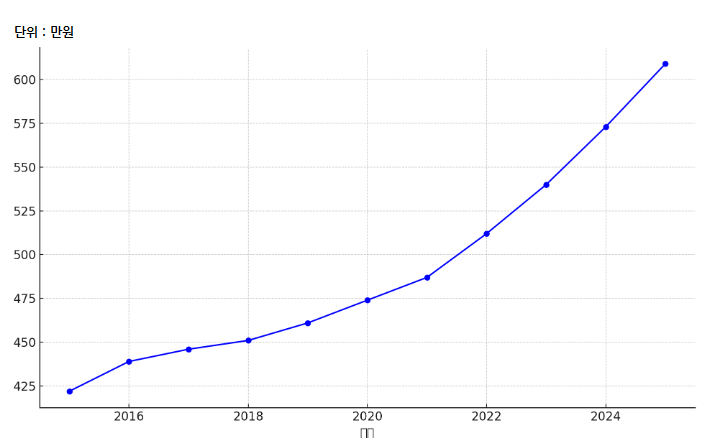 에서 확인할 수 있는 바와 같이, 2015년부터 2025년까지의 중위소득 변화를 그래프로 나타낸 것입니다. 이 그래프는 중위소득이 지속적으로 상승하고 있음을 보여줍니다.