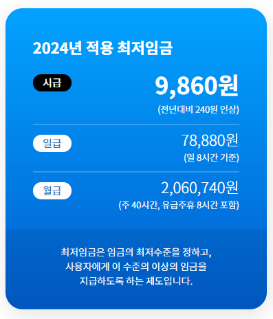 최저임금은 매년 변동이 있을 수 있으므로, 항상 최신 정보를 확인하는 것이 중요합니다. 2024년 최저임금은 9,860원이었으며, 이는 2025년 최저임금과 비교할 때 240원이 증가한 수치입니다.